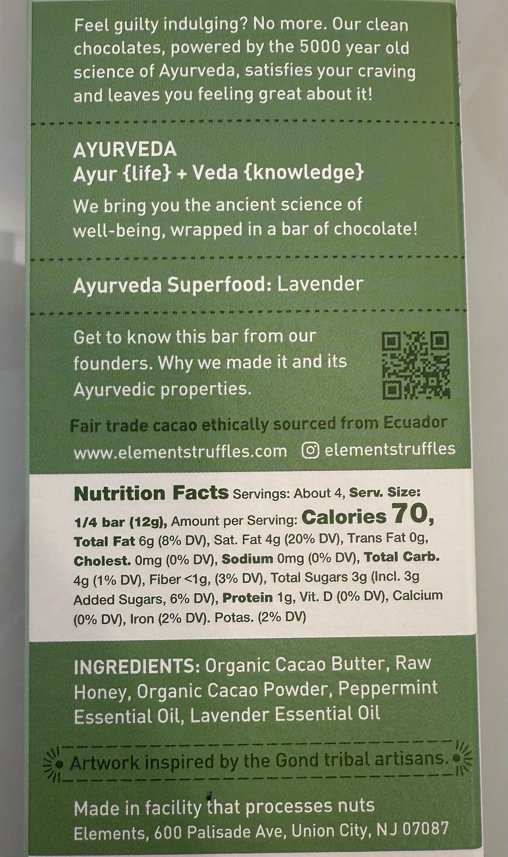Cool peppermint meets soft lavender in this soothing, guilt-free bar. Made with fair-trade Ecuadorian cacao, raw honey, and just 3g of sugar per serving—refreshing indulgence without anything artificial.